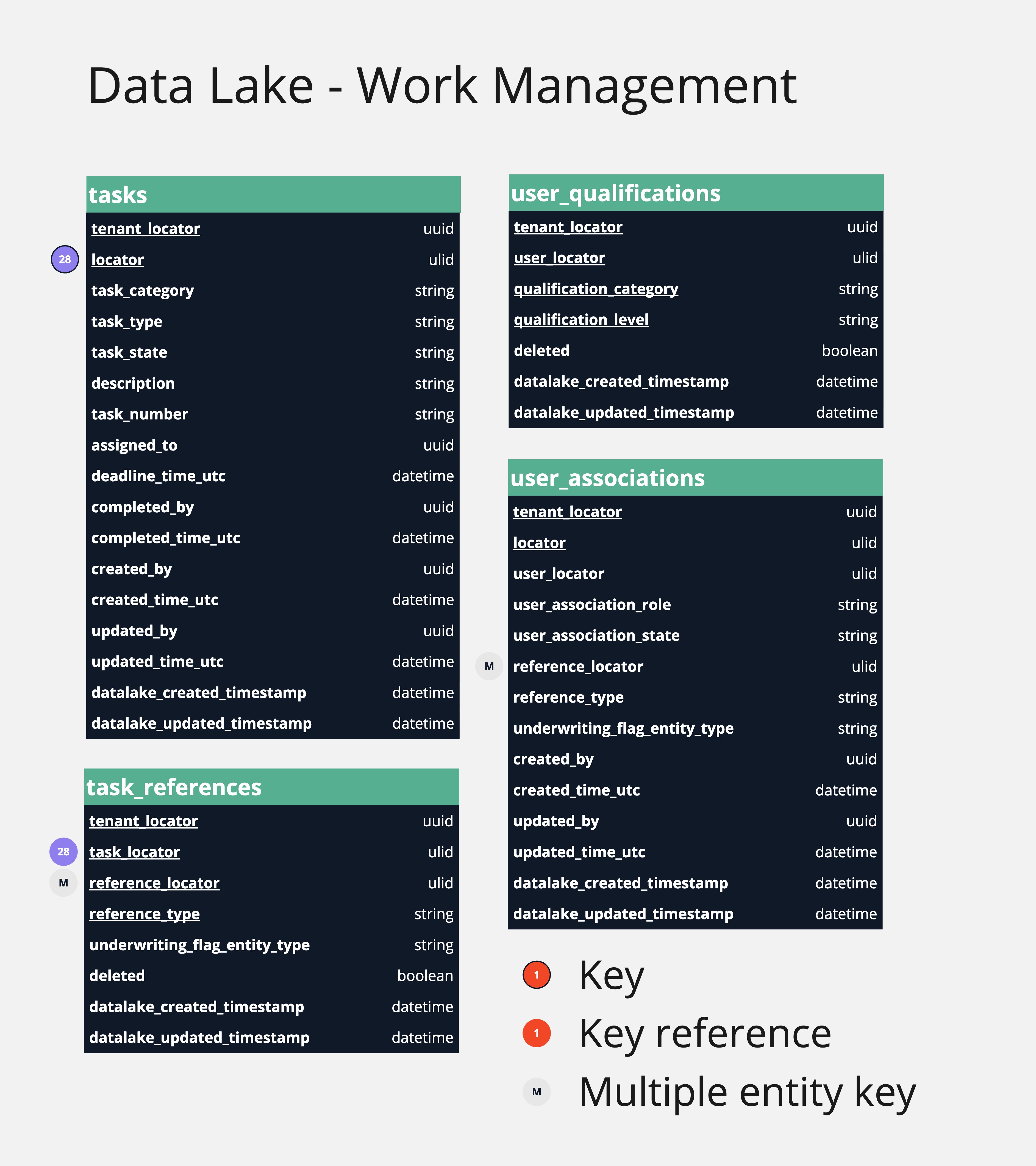 Tables in Data Lake use composite primary keys to uniquely identify rows, combining tenant_locator with a locator when available. Tables without a locator use composite primary keys made up of tenant_locator with combinations of foreign keys or other identifying fields appropriate to each entity.